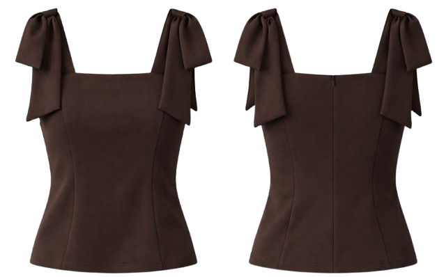 Top musculosa confeccionado en crepe de punto, con escote cuadrado y breteles anchos regulables mediante lazos. Presenta un calce cómodo y moderno. Está confeccionada con 60% de poliéster y 40% de spandex.