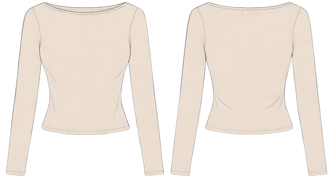 Remera de manga larga confeccionada en algodón con lycra spandex, con cuello bote y vista frontal invisible que permite usarla sin ropa interior, ofreciendo soporte al busto. Está confeccionado con 60% algodón y 40% spandex.
